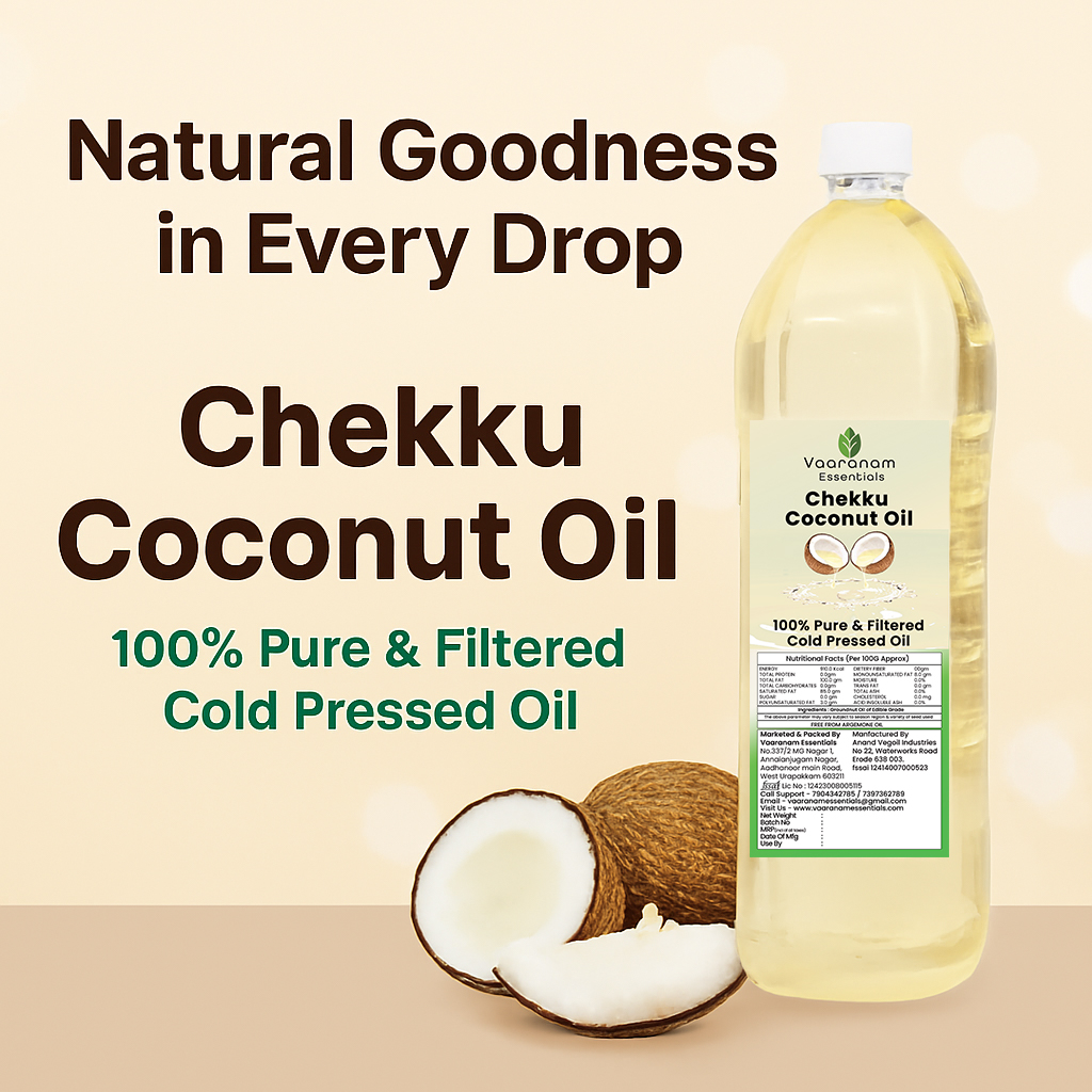 Buy 100% pure Chekku Coconut Oil made using traditional cold-pressed methods. Naturally aromatic, chemical-free and ideal for cooking & wellness.