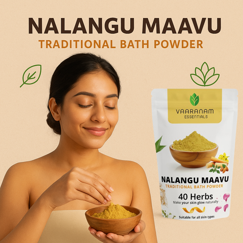 Experience the age-old beauty secret of South India with Vaaranam Essentials Nalangu Maavu. Made from 40 powerful herbs, this traditional bath powder gently cleanses, exfoliates, and nourishes your skin. It helps remove tan, control excess oil, and leave your skin soft, smooth, and glowing — naturally.