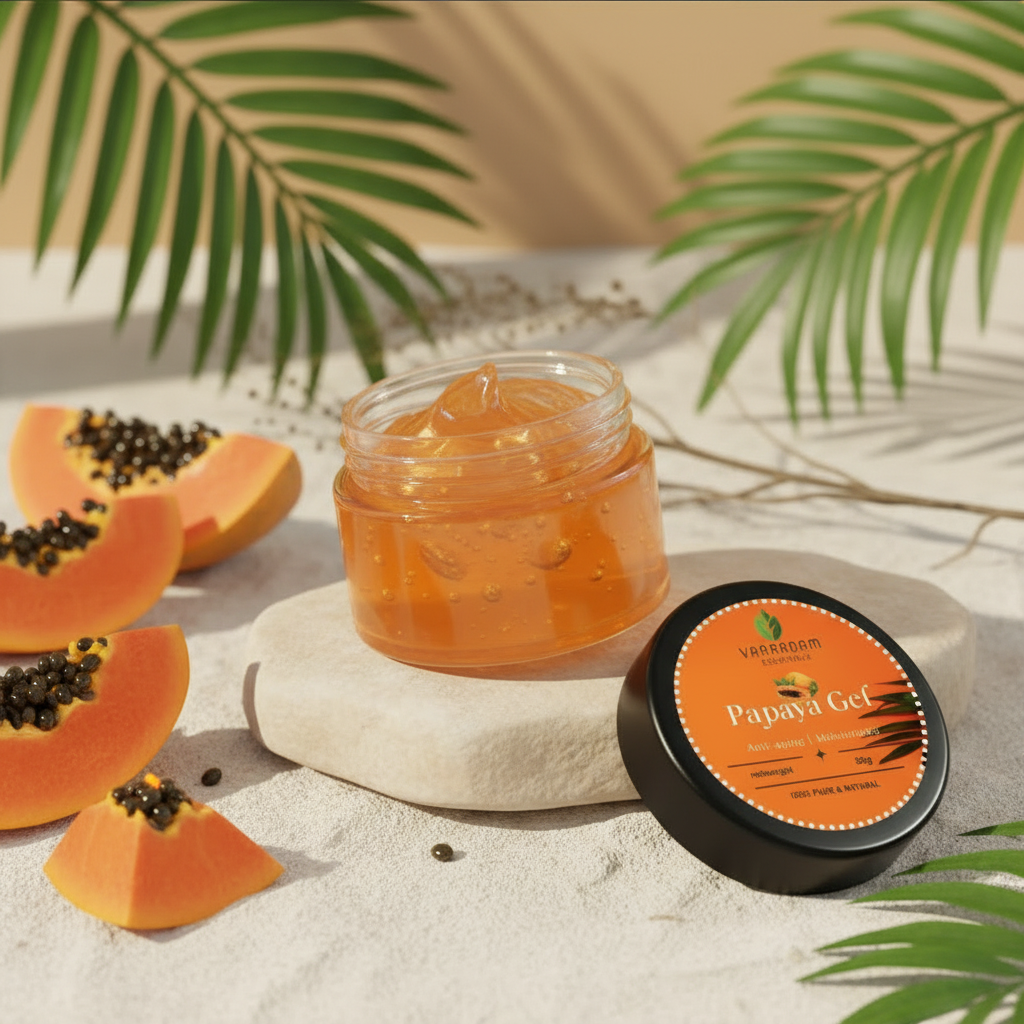 Vaaranam Essentials Papaya Gel is a lightweight, fast-absorbing face gel enriched with natural Papaya Extract to help brighten dull skin, improve texture, and promote a healthy glow. Known for its natural enzymes, papaya gently supports exfoliation, helping remove dead skin cells and reveal smoother, fresher-looking skin.