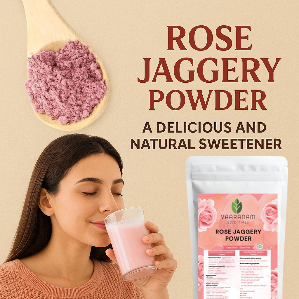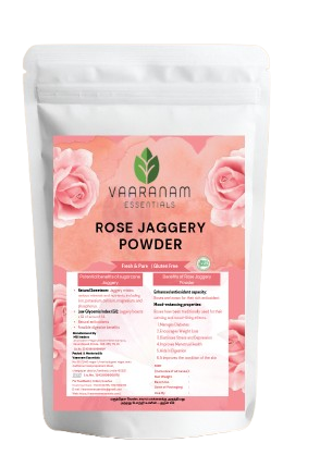Rose Jaggery Powder from Vaaranam Essentials is an interesting and unique product. This organic sweetener blends the richness of jaggery with the delicate fragrance of rose, providing a natural alternative to refined sugar. Here are some key benefits and uses of Rose Jaggery Powder:
